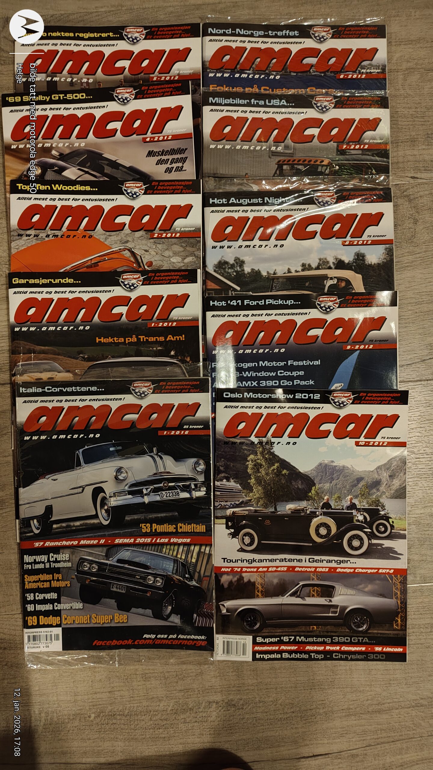 Amcar bilmagasin i flere utgaver. Magasinene dekker ulike temaer innen bil, inkludert bilmodeller, motorer og bilhistorie. Passer for bilentusiaster og samlere. Dette er 2012 årgangen, men her mangler utgave 3, elles er nr 6,7 & 8 uåpnet i orinal plast, de resterende 6 åpnet, legger ved nr 1 2016 uåpnet som erstatning for nr 3.