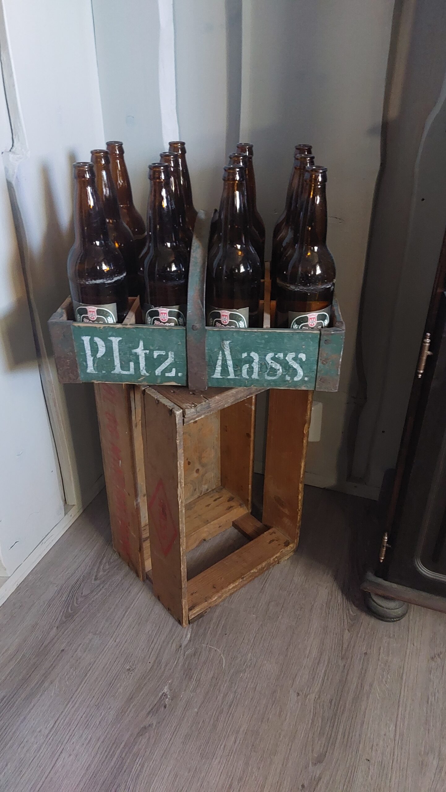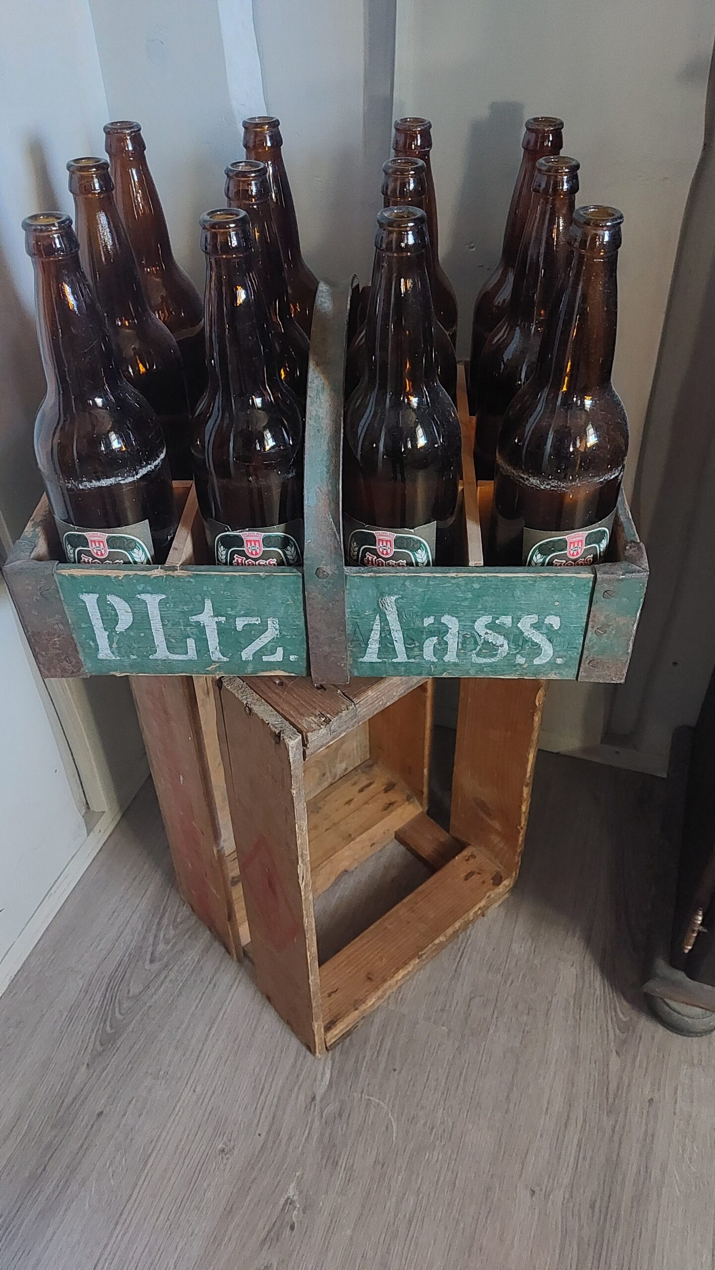 Eldre ølkasse i tre med metall håndtak og 12 tidsriktige store ølflasker. Flaskene har originale etiketter. I tillegg følger det med en trekasse med Aass emblem.