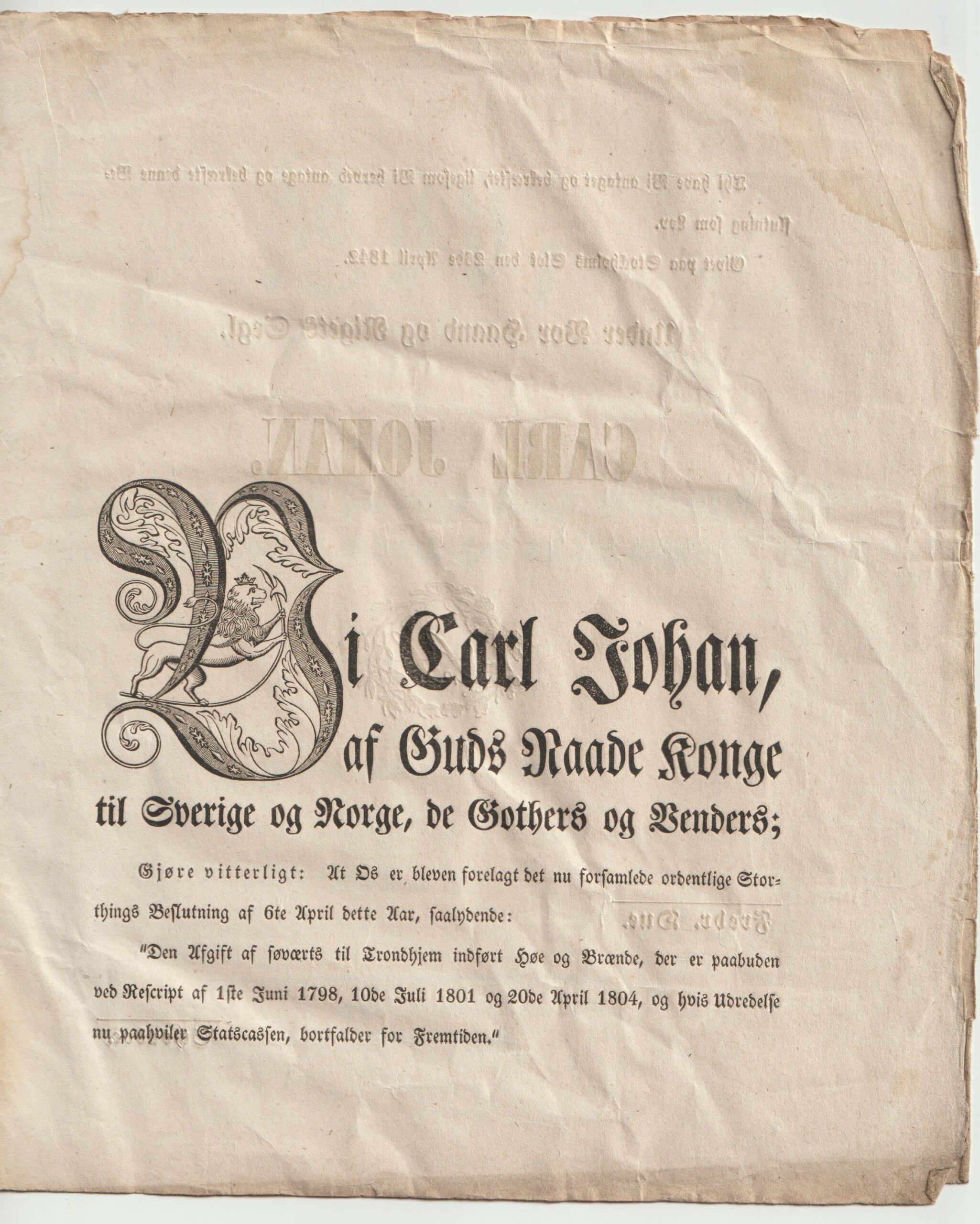 Gammel LOV fra Kong Carl Johan fra 1842. Konge i Norge og Sverige 1818 – 1844 +porto