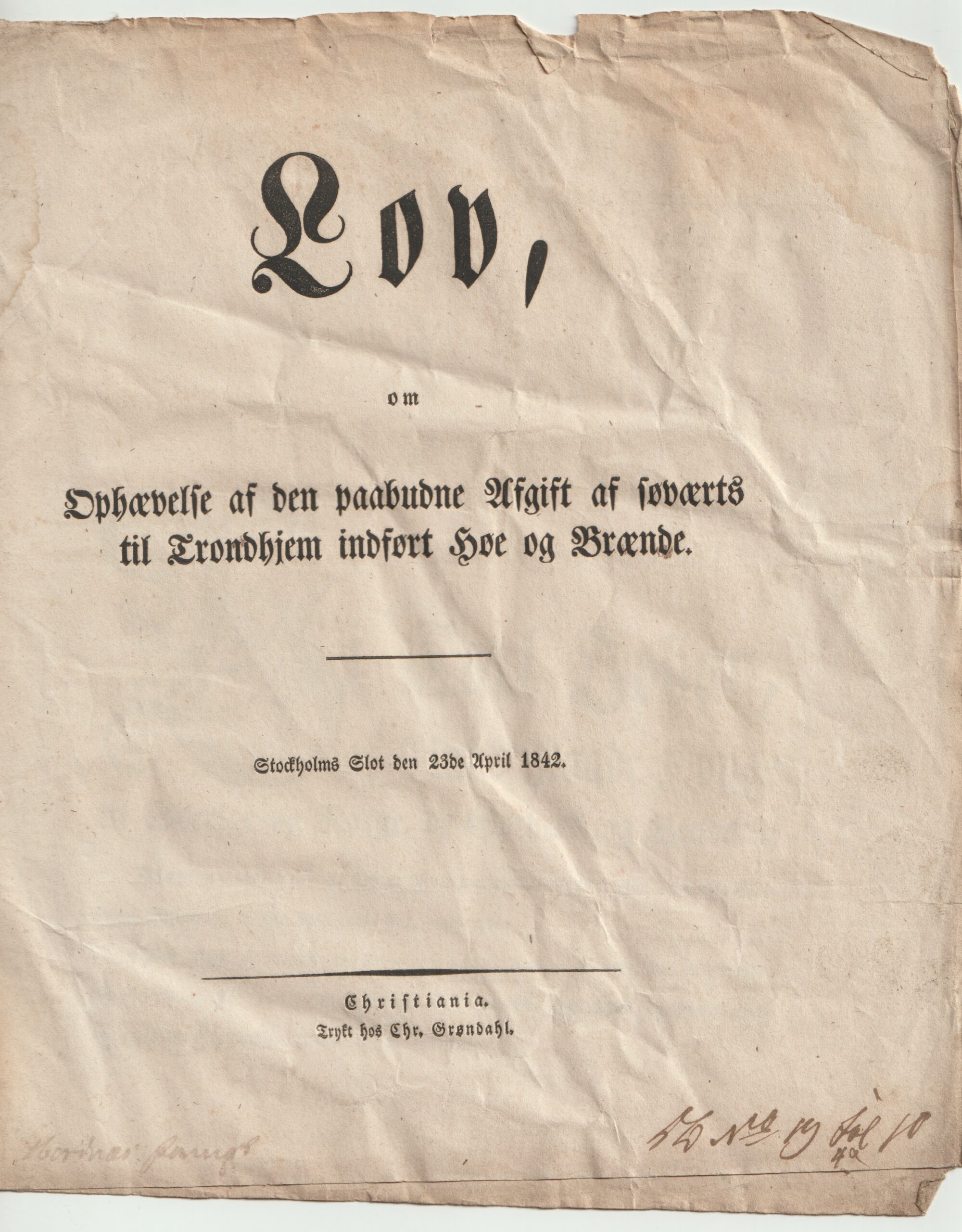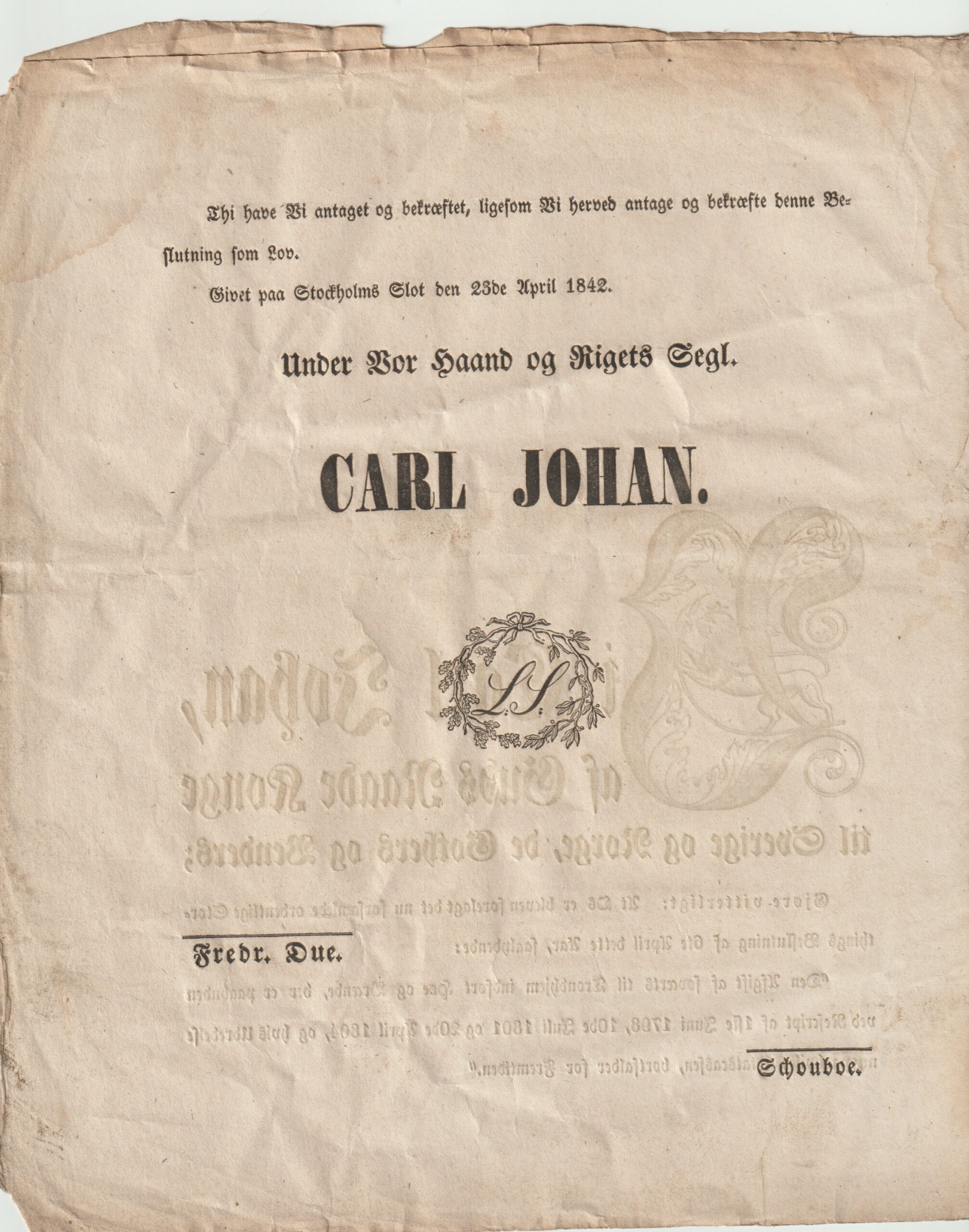 Gammel LOV fra Kong Carl Johan fra 1842. Konge i Norge og Sverige 1818 – 1844.