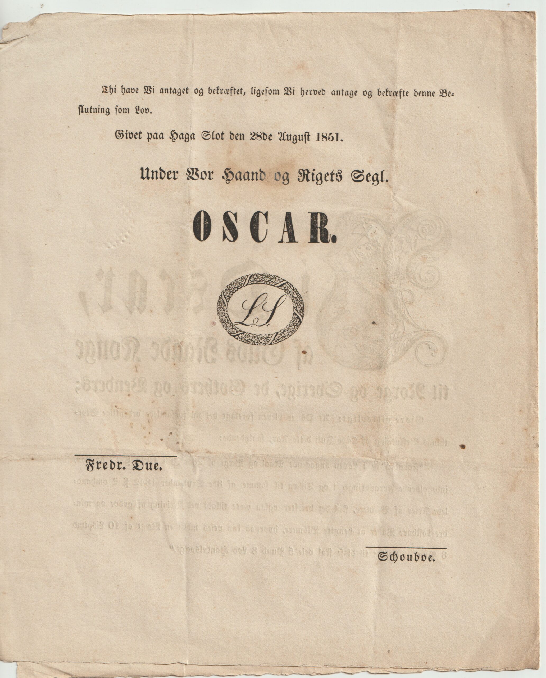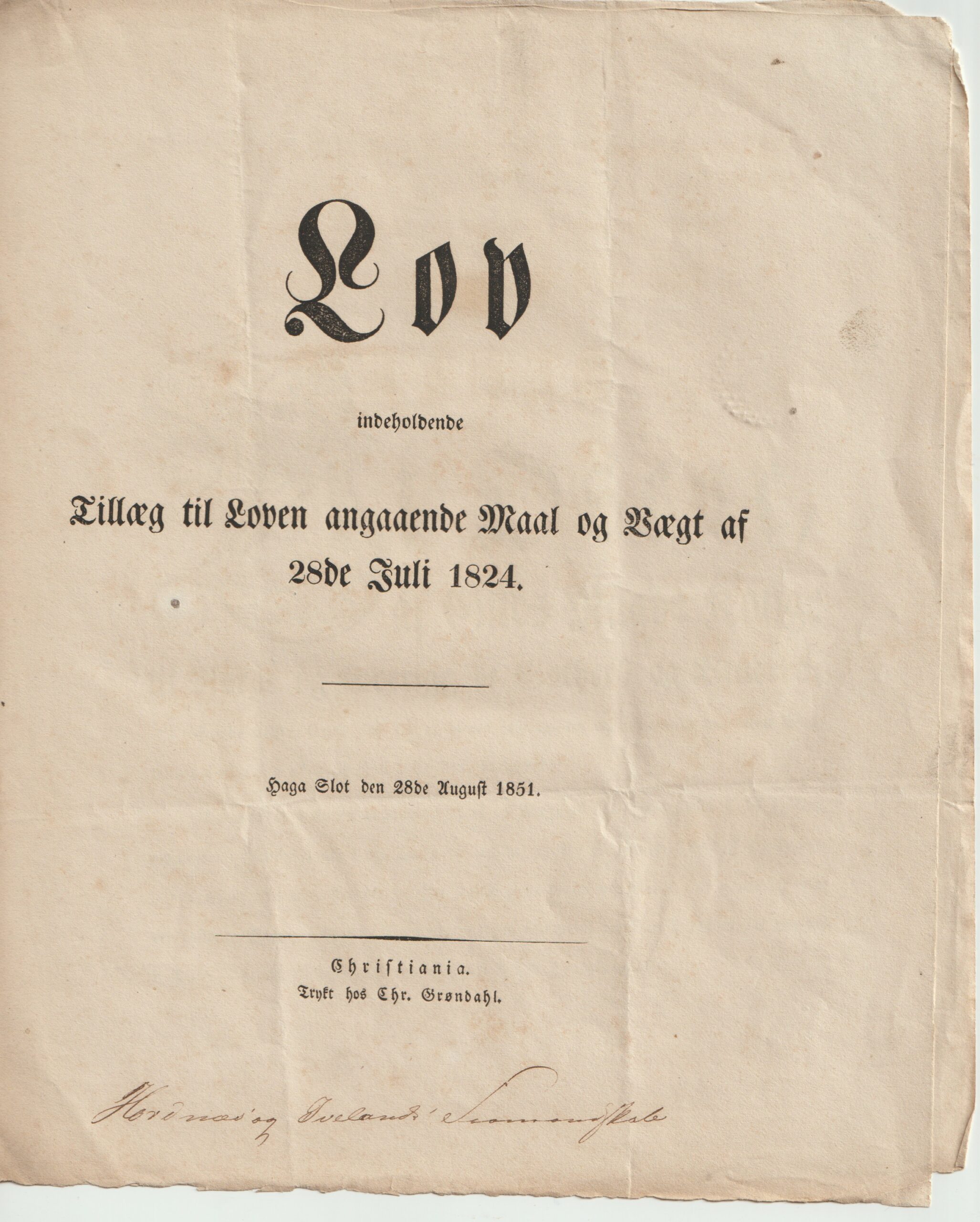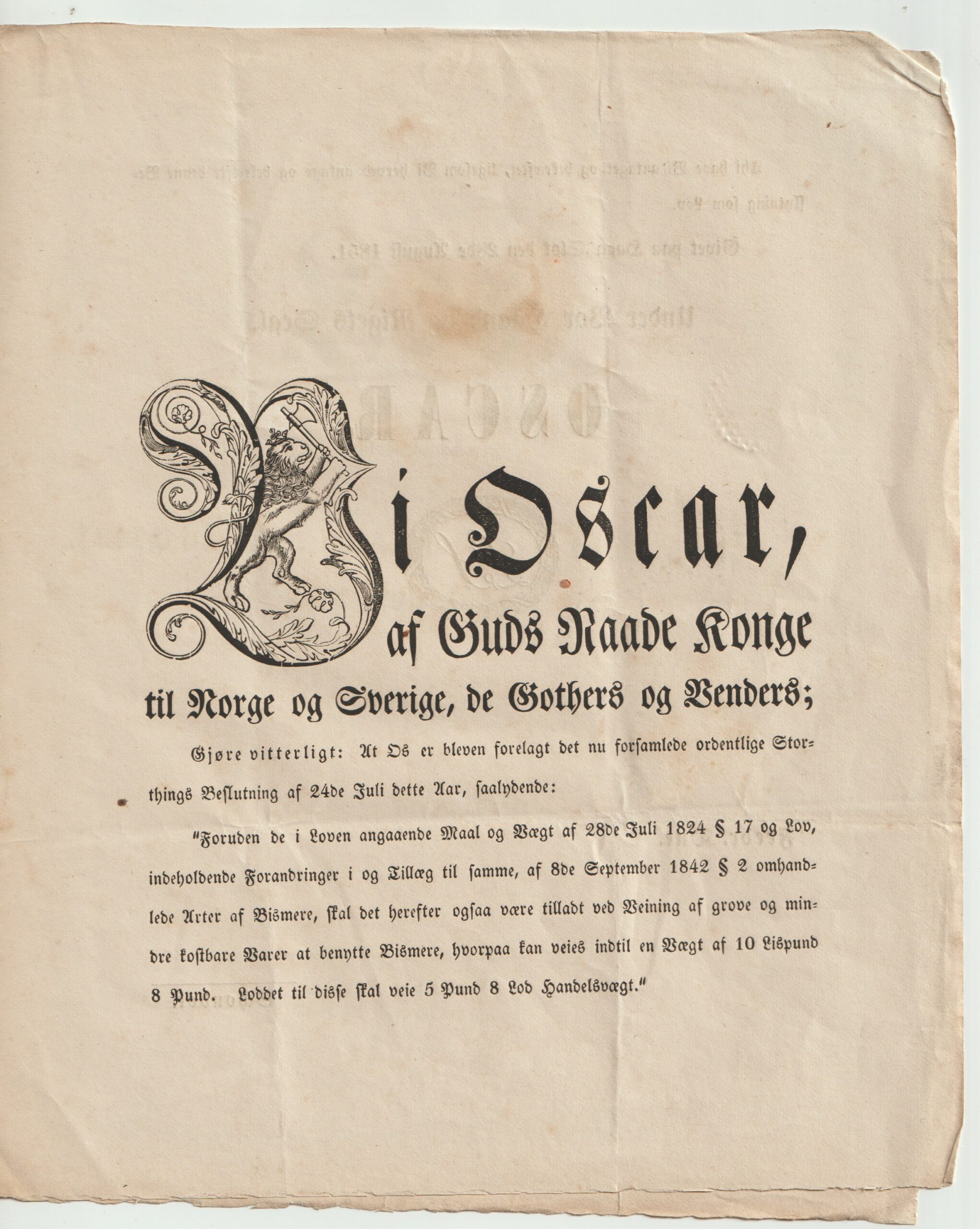 Lov fra Kong OSCAR 1851. Om tilleg til loven ang. mål og vekt fra 1824. Kong Oscar var konge i Norge og Sverige 1844 til 1859.
