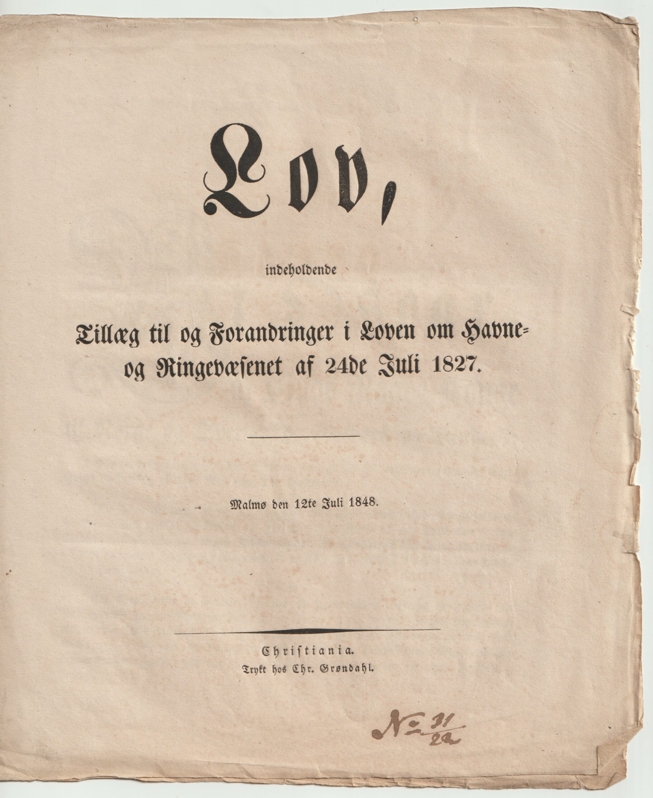 Lov fra Kong Oscar om tillegg og forandringer om fartøyers told avgifter 1827. + porto
