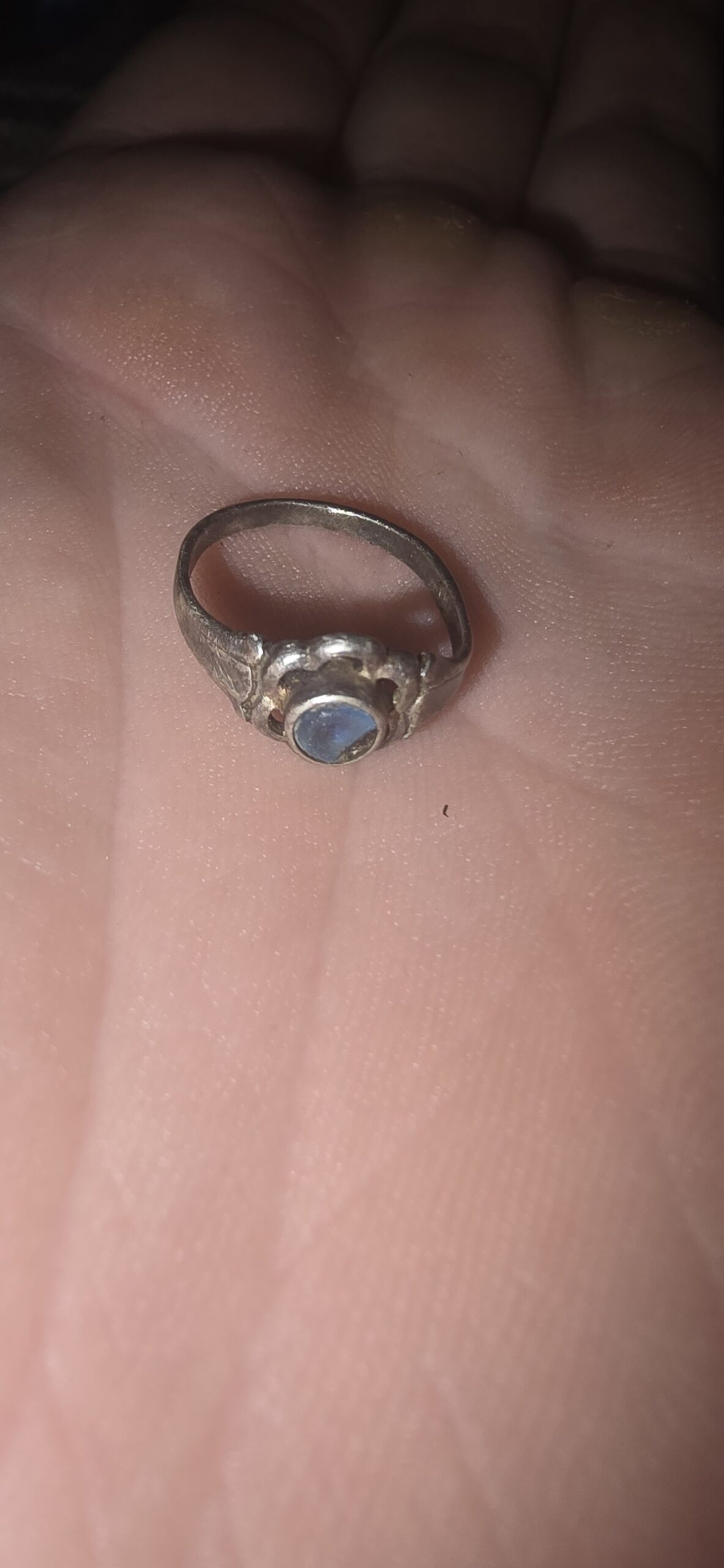 Ringen er svært liten og trolig laget til et barn på 1940–60-tallet – kanskje en konfirmasjonsgave eller et hverdagslig smykke som har ligget tapt i naturen i mange tiår.